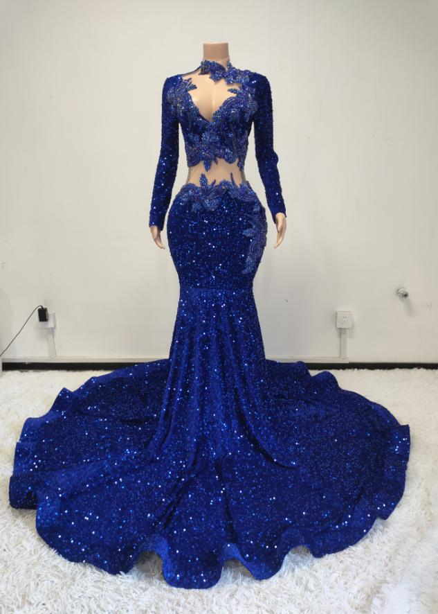 Vallen Royal Blue Long Sleeve Sequined Prom Dress - Ready to Ship