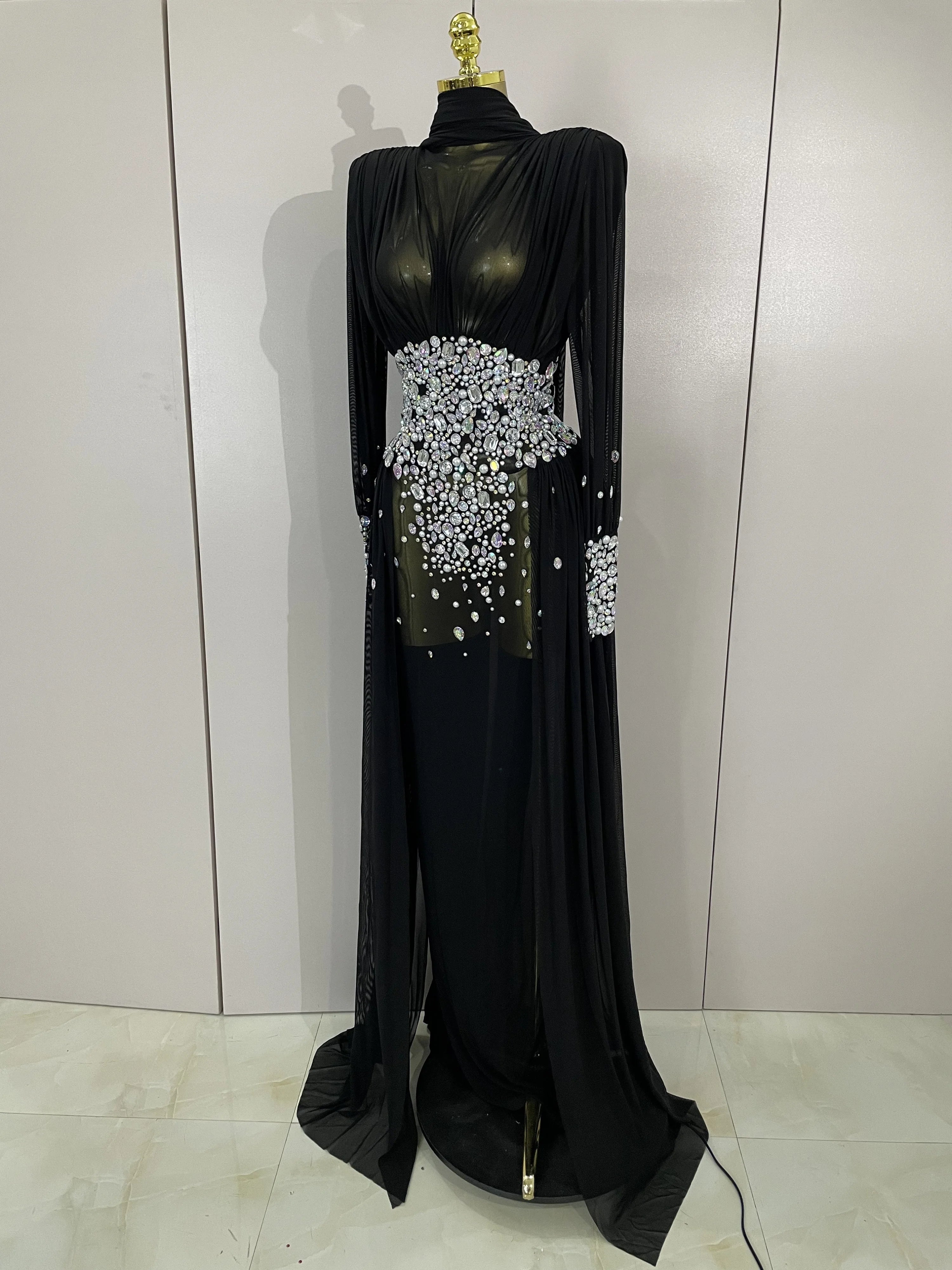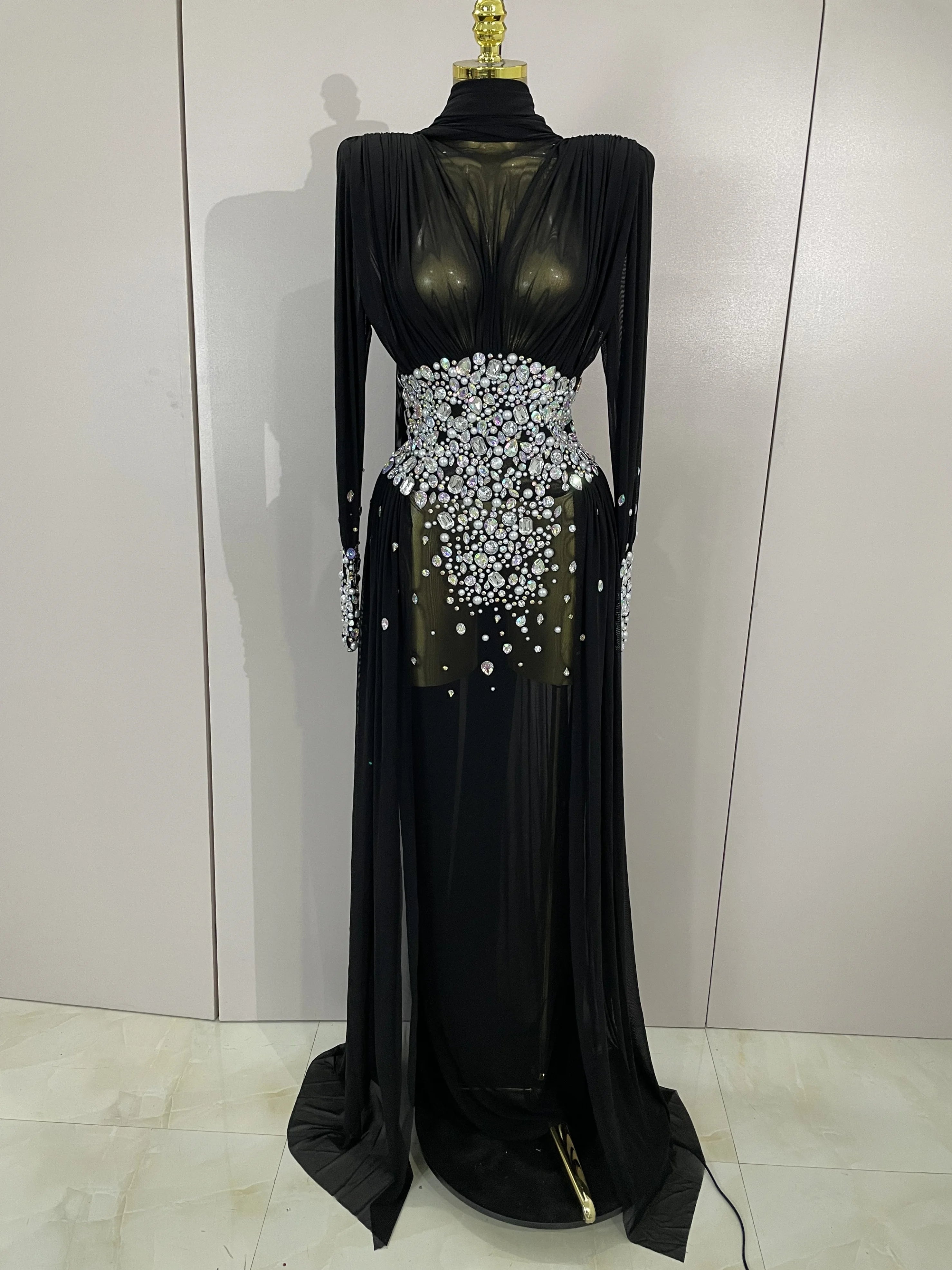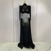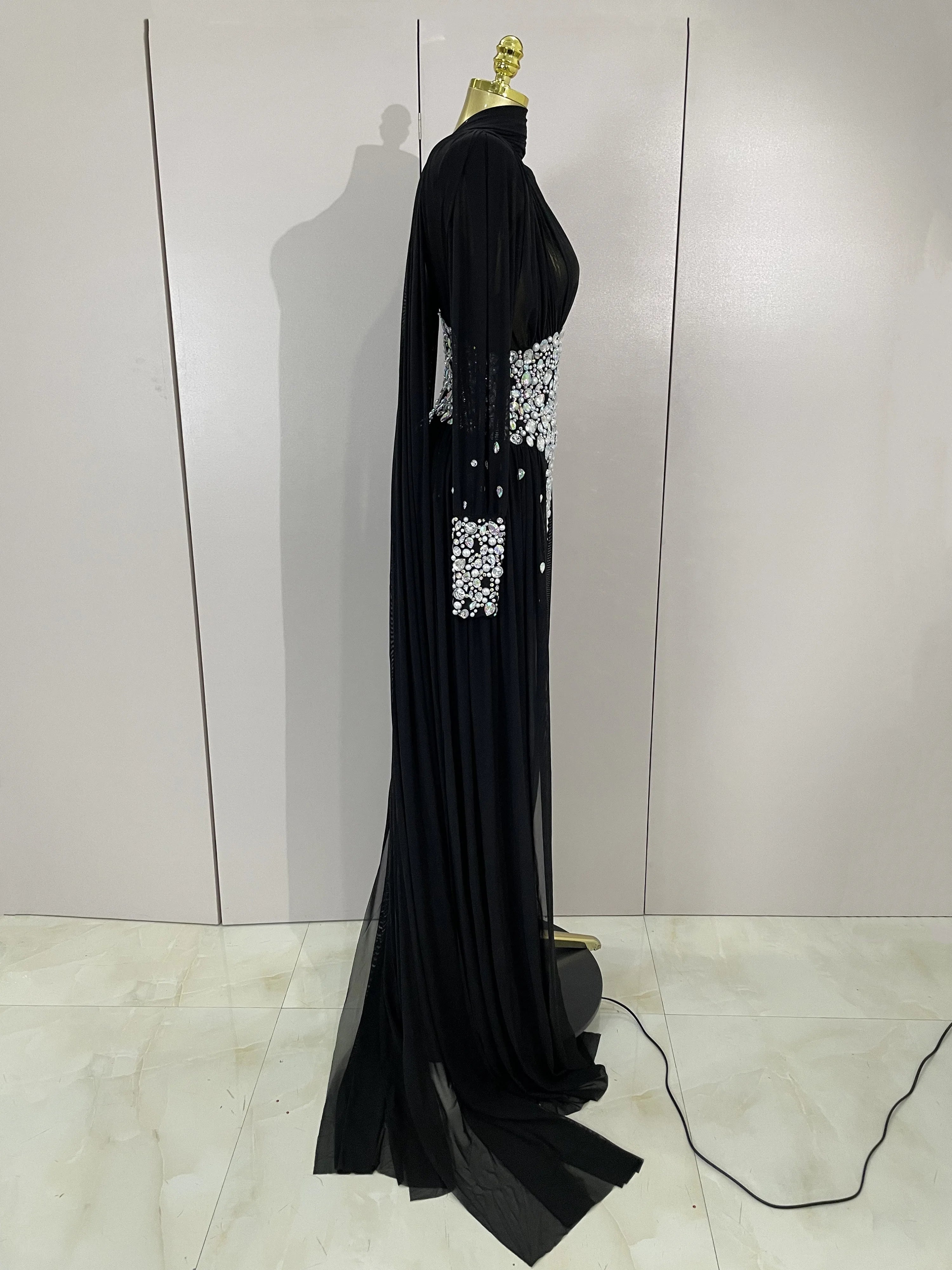 Alie Elegant Sparkly Diamond Long Sleeve Mesh See-Through Maxi Abaya Party Dress