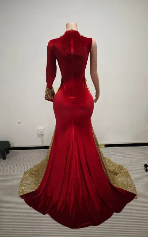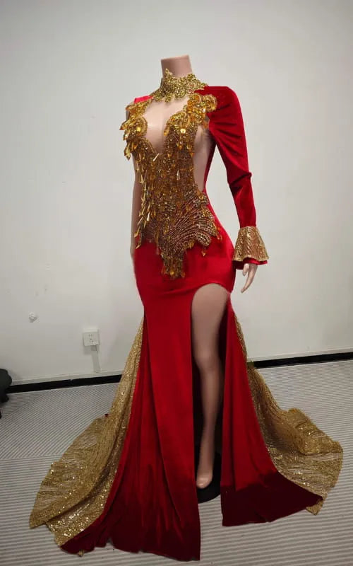 This elegant red prom dress is built for drama in the best way. Gold crystal rhinestones catch the light with every move, while the high-neck choker detail adds a bold, fashion-forward edge. The fitted silhouette flows into a statement train that brings full luxury energy without trying too hard. Perfect for prom, pageants, red carpet moments, and upscale evening events where you want eyes on you the second you walk in.