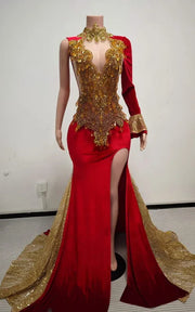 Elegant Red With Gold Crystal Rhinestones Train Prom Dress with High-Neck Choker
