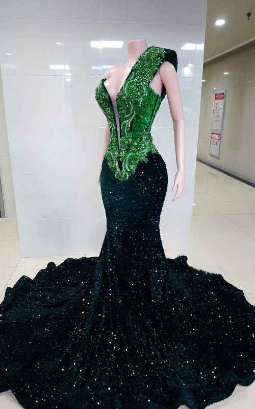 This Emerald Peak mermaid prom gown is built to shine without overdoing it. The glittering basqued bodice shapes and defines the waist, giving a sharp, sculpted fit that feels luxe and flattering. The mermaid silhouette flows into a sequin flare that catches light with every step, adding movement and drama in just the right amount. Rich emerald tones bring that powerful, confident vibe. Perfect for prom, formal nights, and entrances that deserve attention.