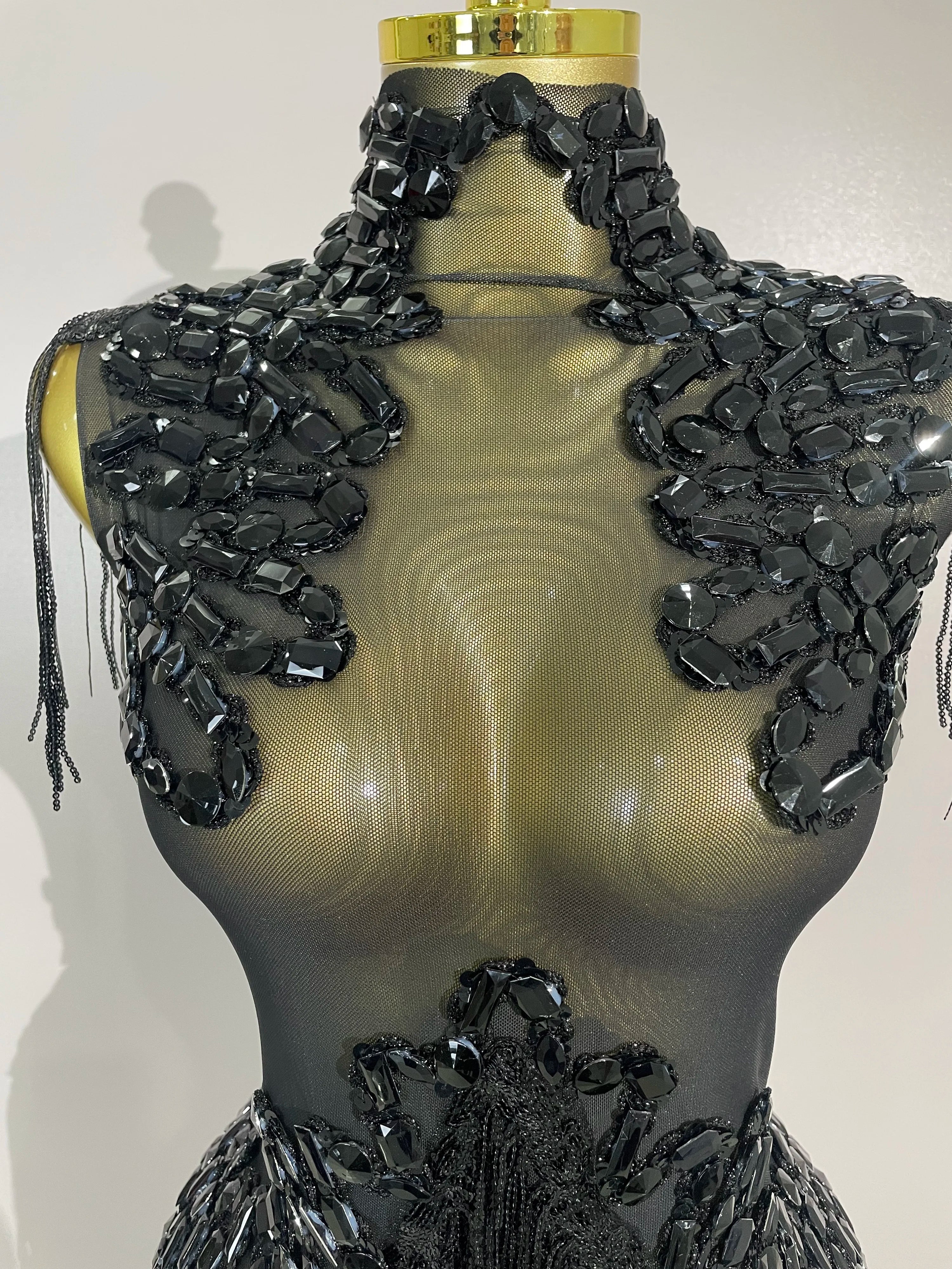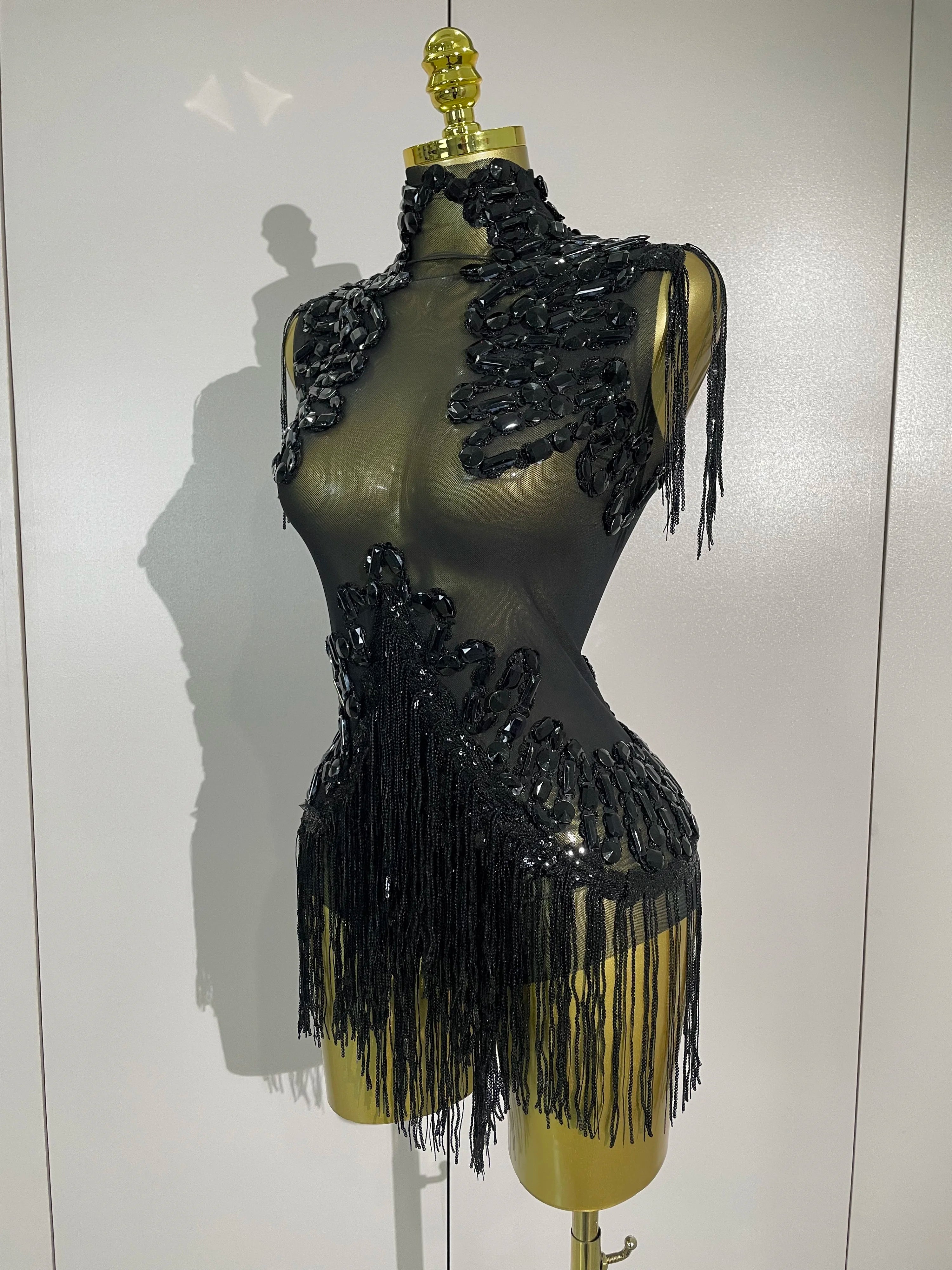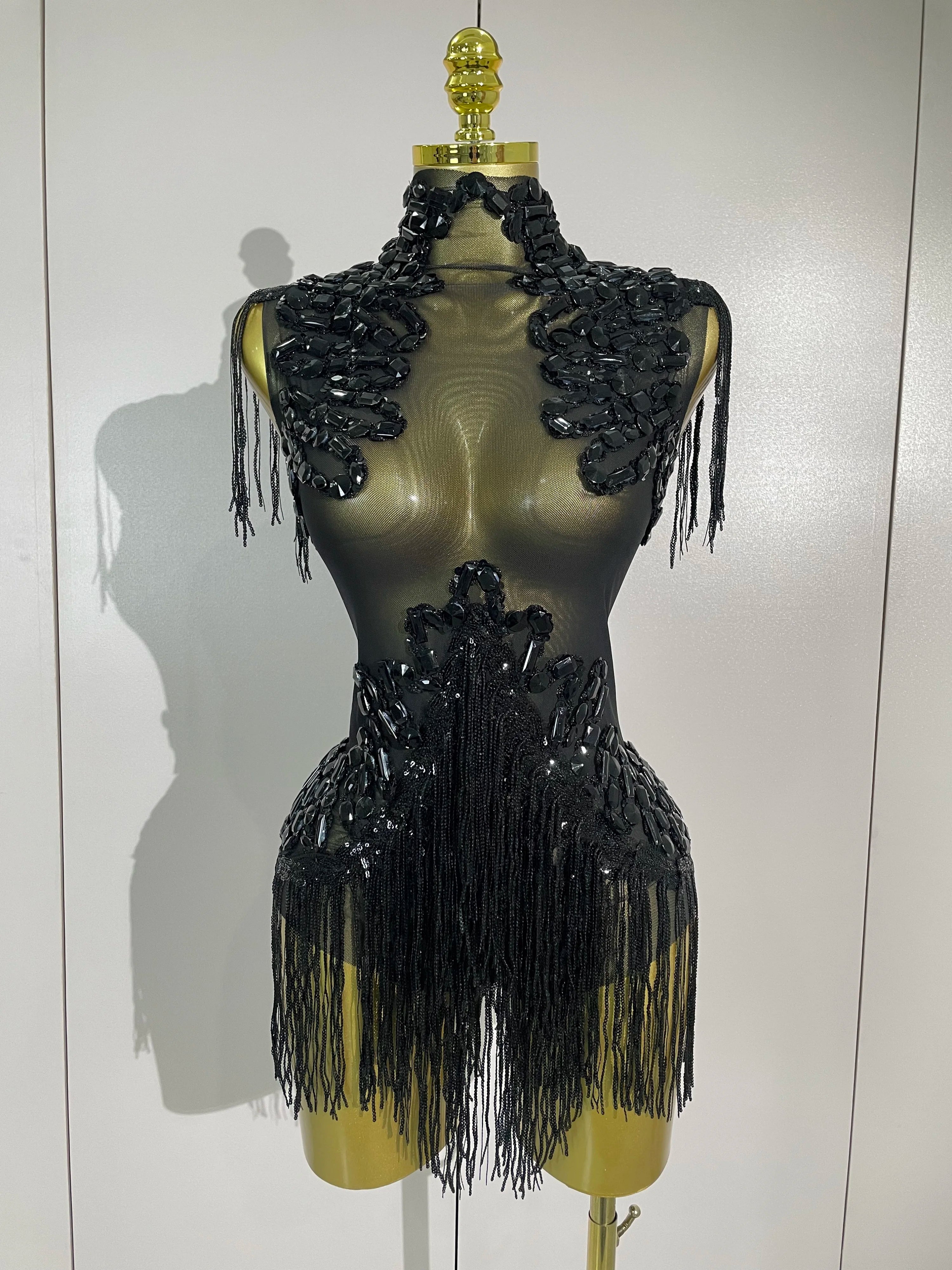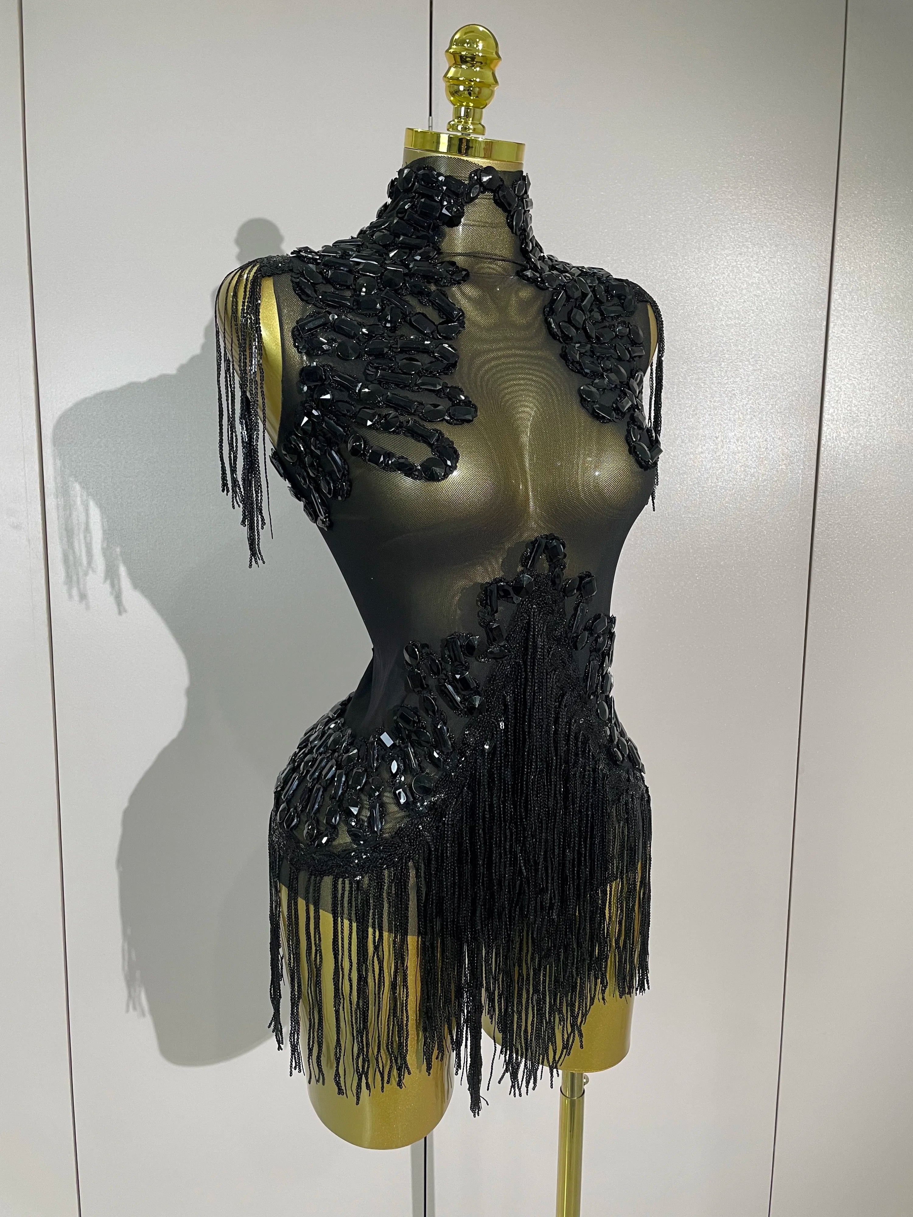 Gabrielle Sparkly Rhinestone Sequin Tassel Mesh See-Through Stretch Bodysuit