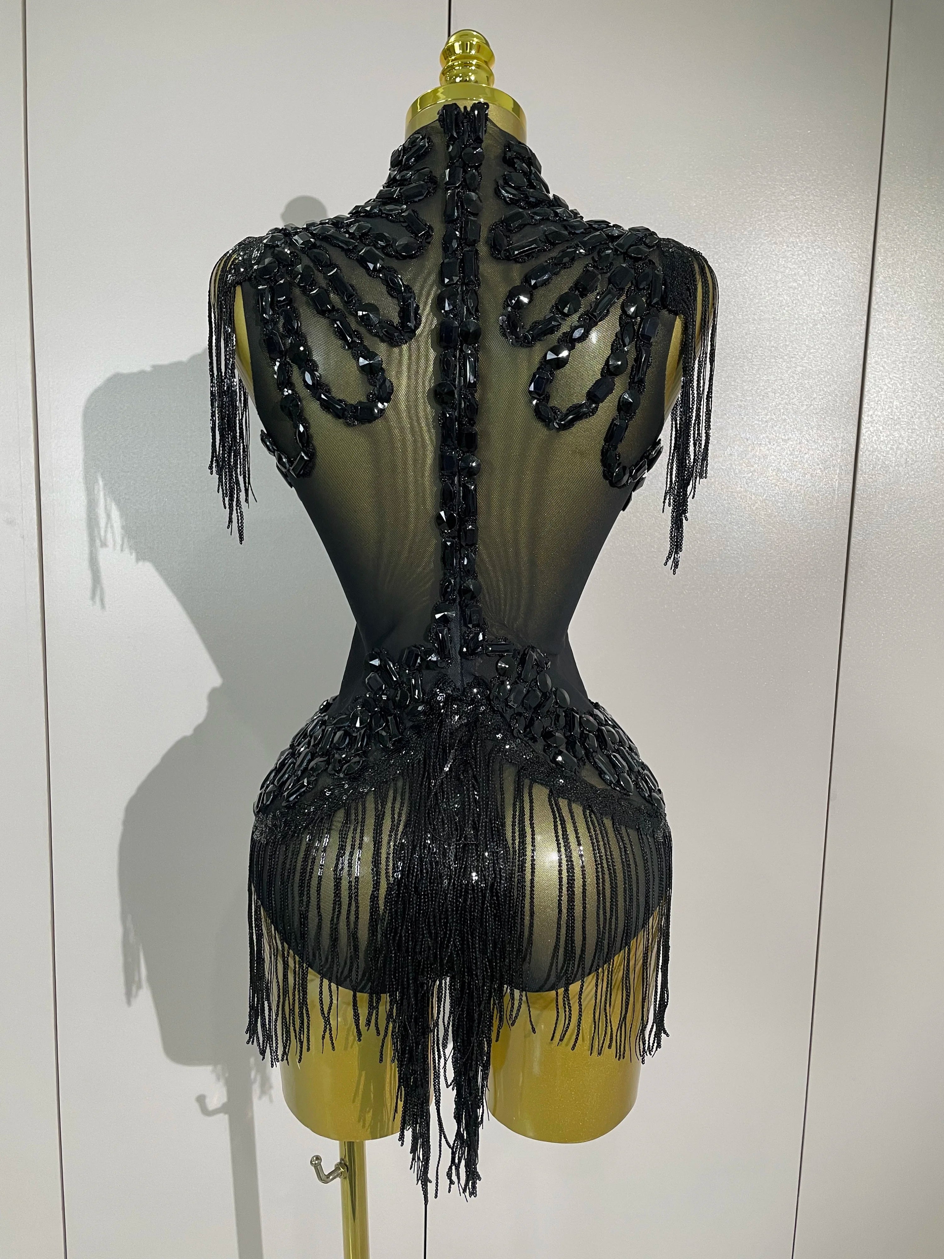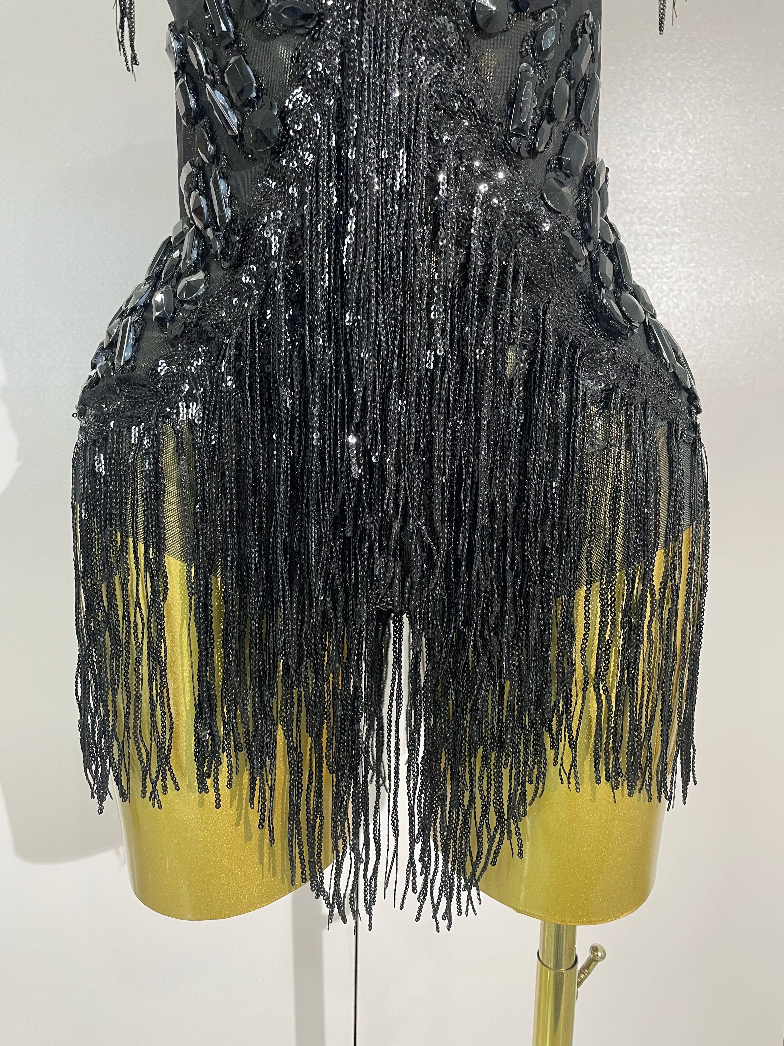 Sparkly rhinestone sequin tassel mesh stretch bodysuit for women’s party, birthday, and stage wear.