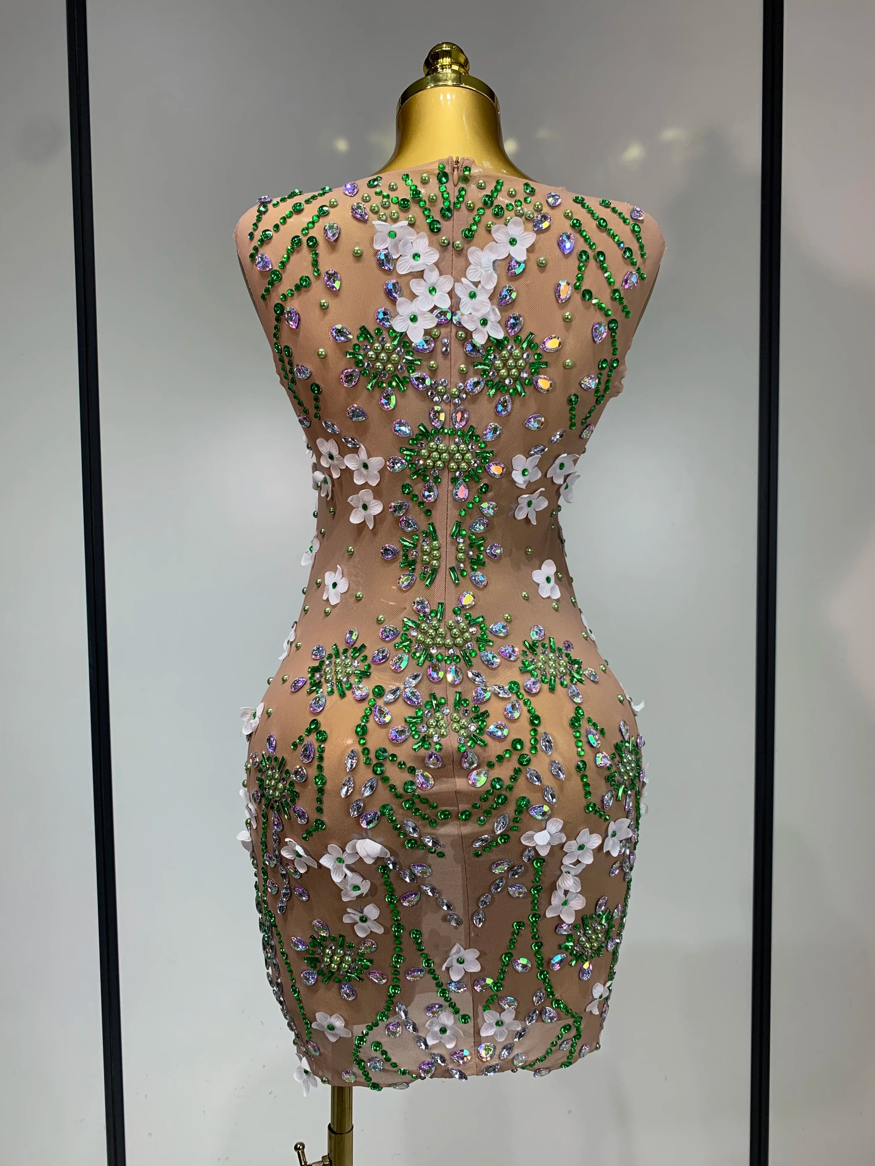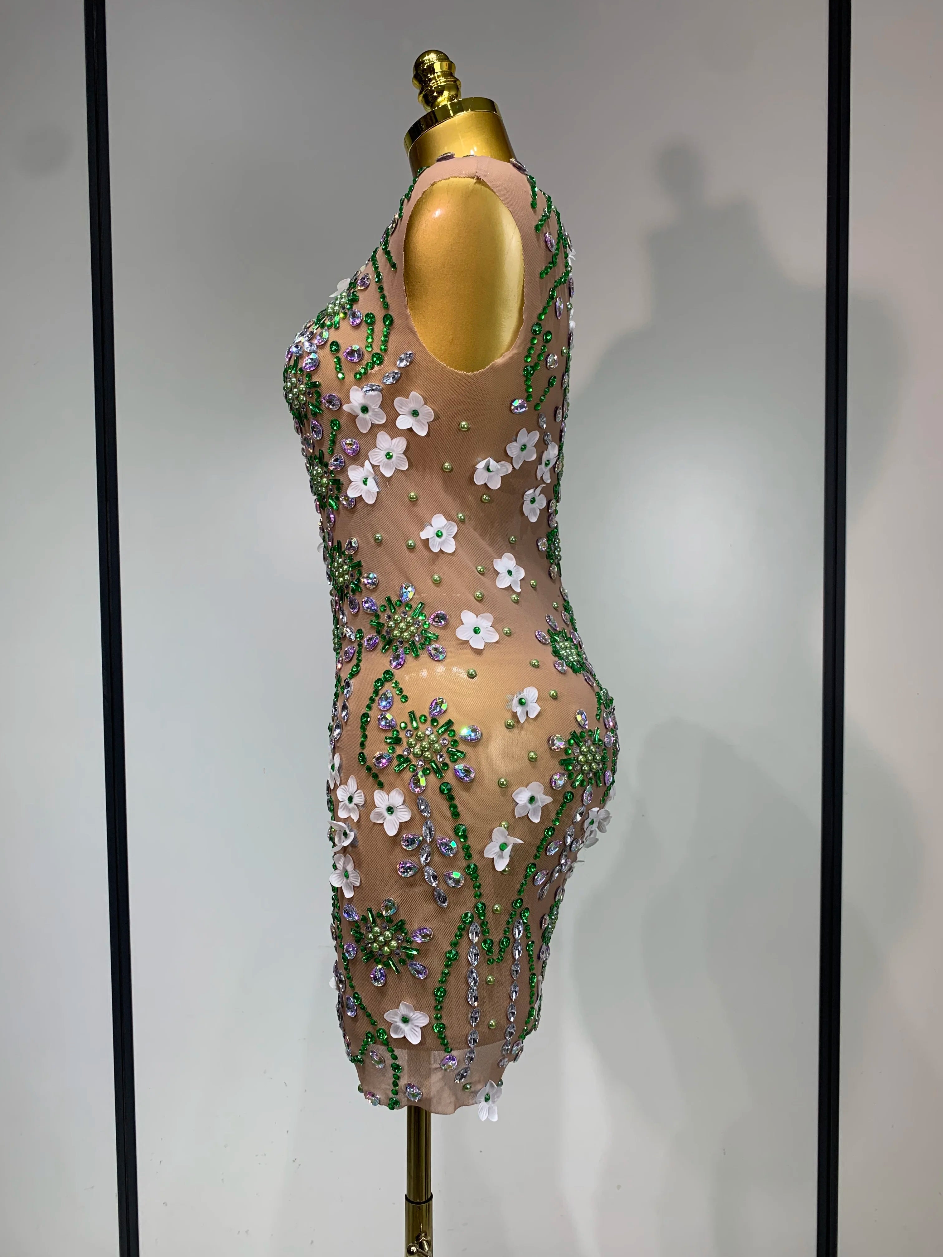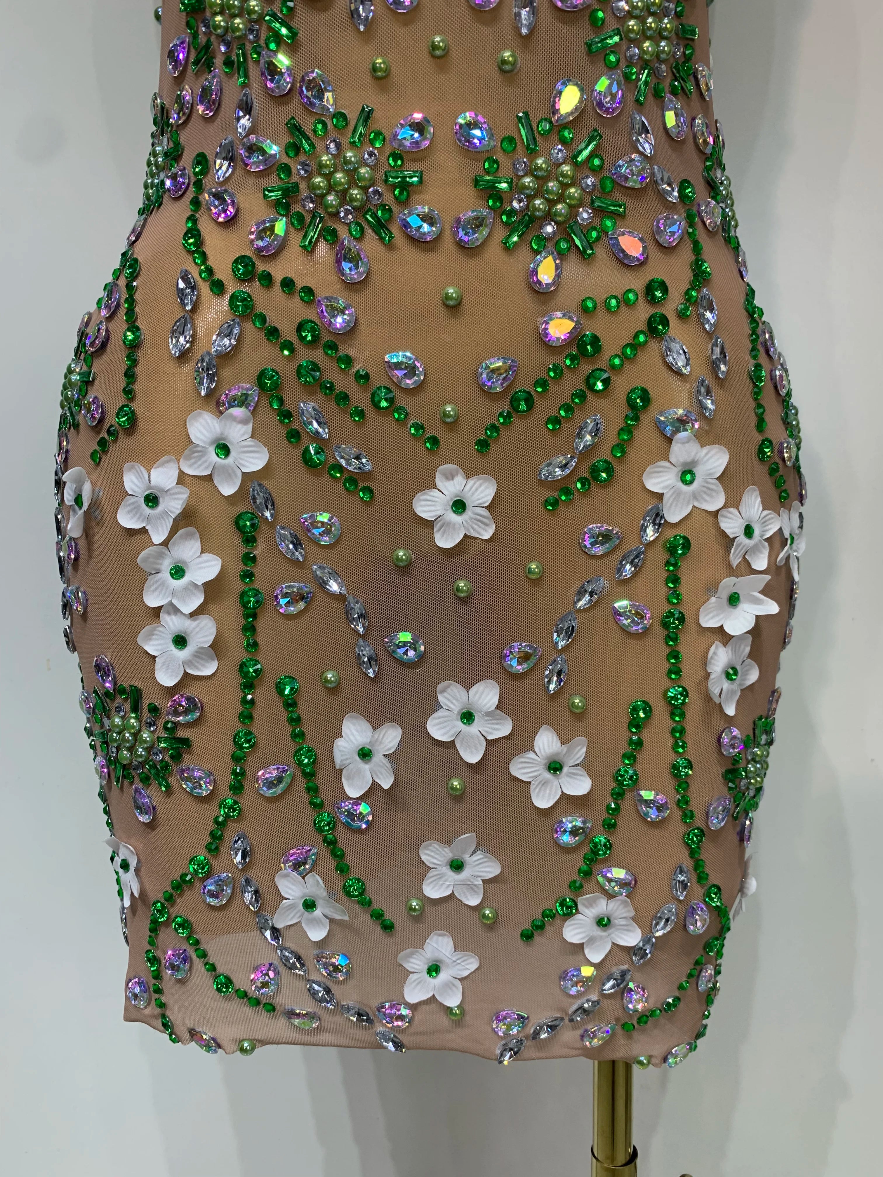 The Georgette Mesh Dress blends delicate floral detail with radiant sparkle. Designed with a sheer see through mesh base, this piece features white flower accents layered with shimmering rhinestones for a luminous, dimensional finish.